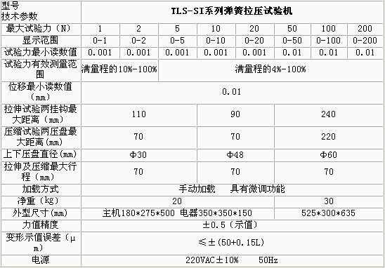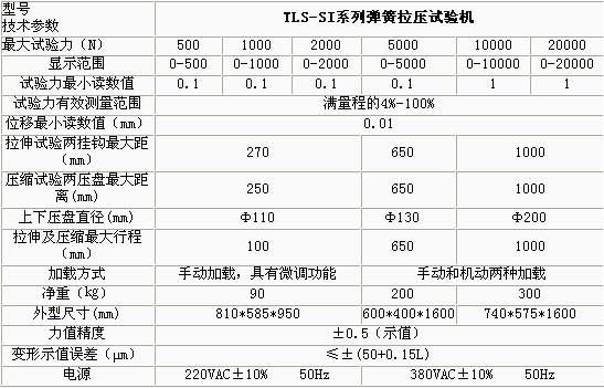 產品概述: TLS-SI系列雙數顯示拉壓彈簧試驗機采用集成電路、微機技術對位移、試驗力兩參數進行電子檢測、數字顯示并對試驗結果進行打印。施加試驗力為手動,還可以對負荷傳感器位移作自動修正。,適用于各種精密拉伸和壓縮螺旋彈簧試驗機及對脆性材料的強度測 功能特點: 數字顯示位移、負荷,減震器彈簧疲勞試驗機,精確直觀并對試驗結果進行打印 采用ISP技術編程,氣彈簧試驗機,對負荷傳感器的變形自動修正 試驗力、位移任意點清零,彈簧機廠,可任意設定檢測基準 具有峰值保持、過載保護等功能 技術參數: