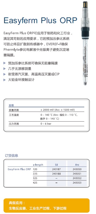 EasyFerm Plus ORP可應(yīng)用于制藥和化工行業(yè),,滿足其苛刻的應(yīng)用要求,,它的預(yù)加壓參比系統(tǒng)可防止樣品擴散到傳感器中,,EVEREF-F確保Phermlyte參比電解液中無銀離子避免沉淀堵塞隔膜。