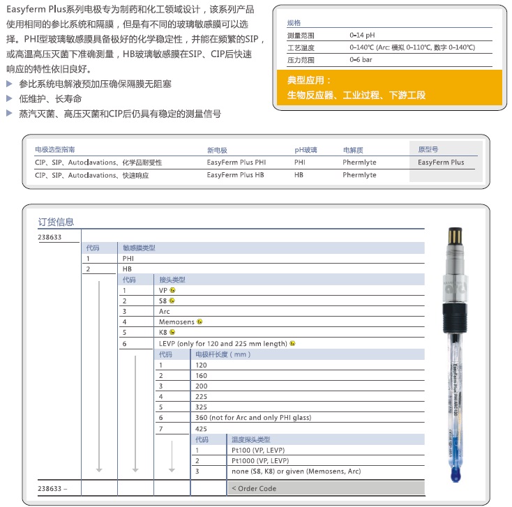 Easyferm Plus系列電極專為制藥和化工領(lǐng)域設(shè)計,,該系列產(chǎn)品使用相同的參比系統(tǒng)和隔膜,,但是有不同的玻璃敏感膜可以選擇。PHI型玻璃敏感膜具備極好的化學(xué)穩(wěn)定性,,并能在頻繁的SIP,,或高溫高壓滅菌下準(zhǔn)確測量,,HB玻璃敏感膜在SIP、CIP后快速響應(yīng)的特性依舊良好。